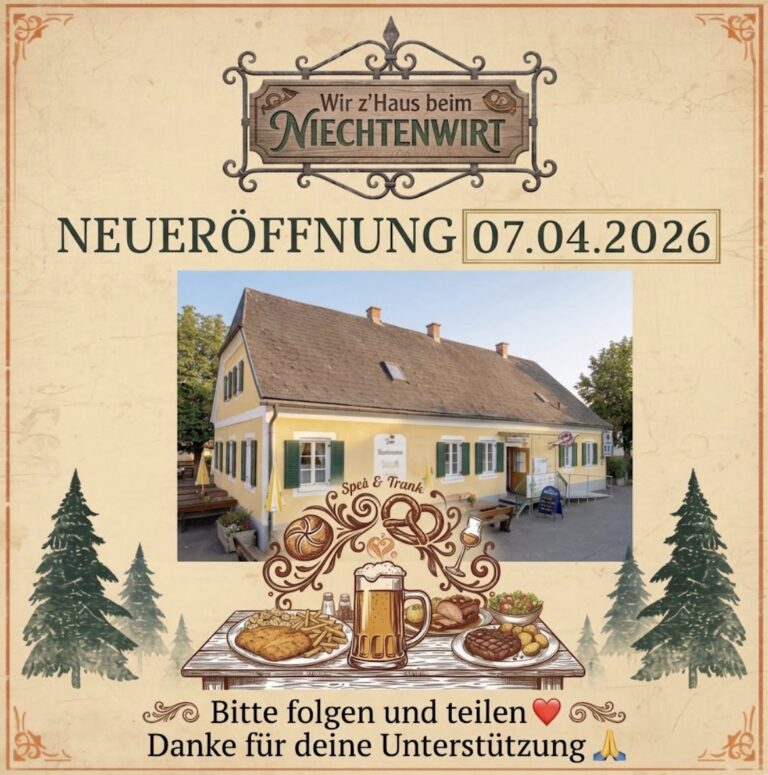 Am 7. April 2026 ist es soweit – der Niechtenwirt eröffnet! ✨ Freu dich auf traditionelle steirische Küche, gemütliche Atmosphäre und genussvolle Stunden in Feldkirchen bei Graz.